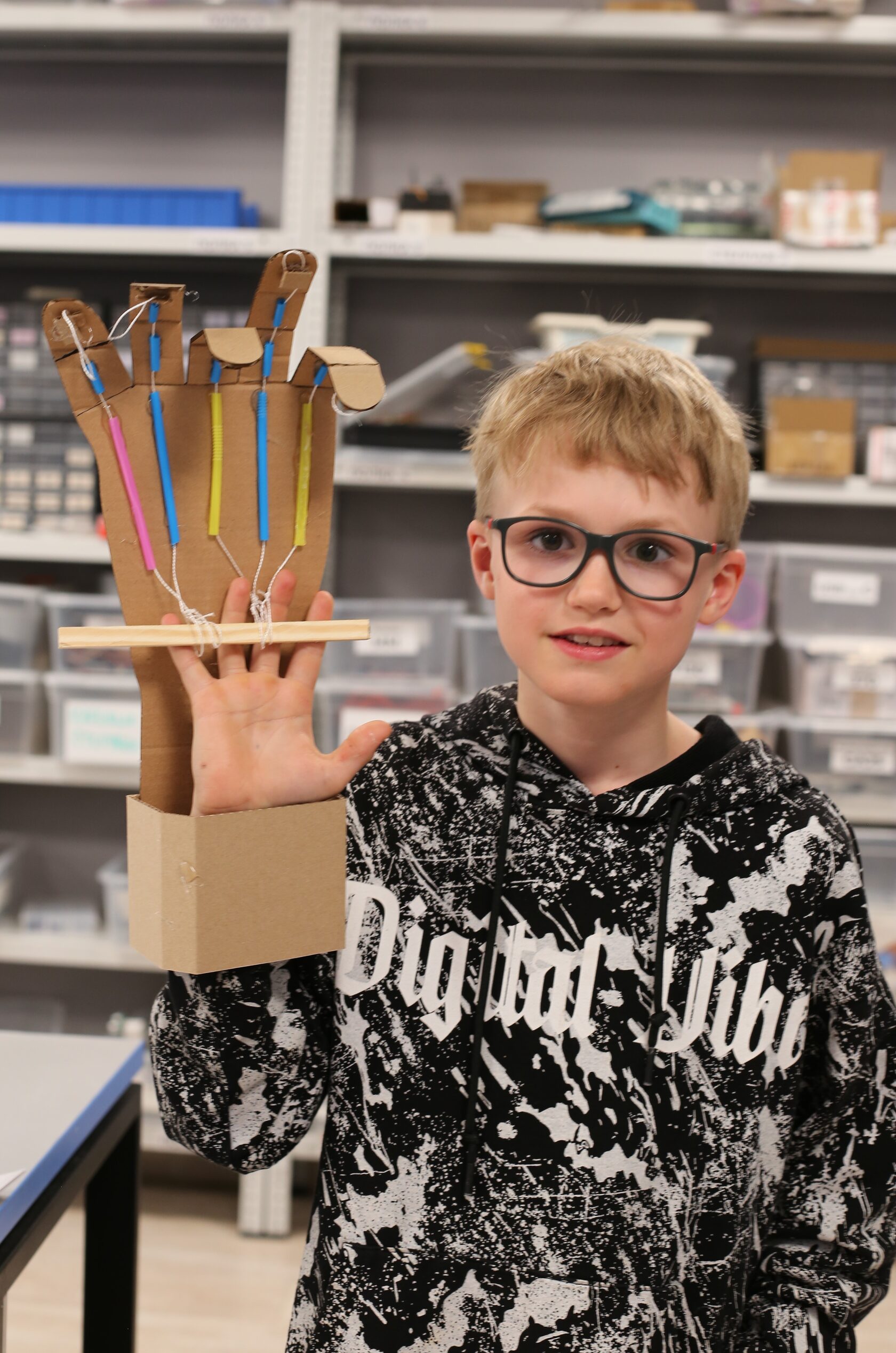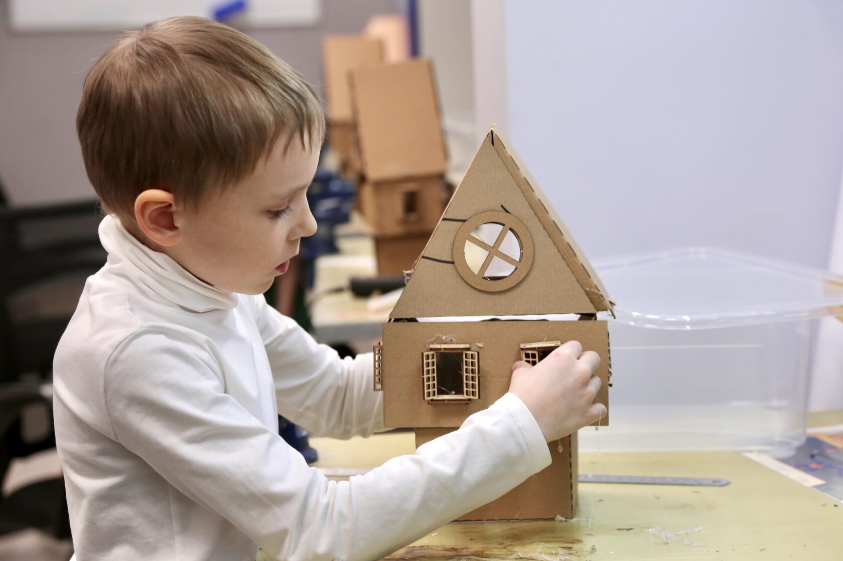 Начнём с весёлых работающих игрушек-поделок из картона, дерева и других подручных материалов, чтобы освоить базовый инструмент (линейка, угольник, ножницы, лобзик, плоскогубцы, термопистолет). И постепенно перейдём к сравнительно сложным инженерным системам.
